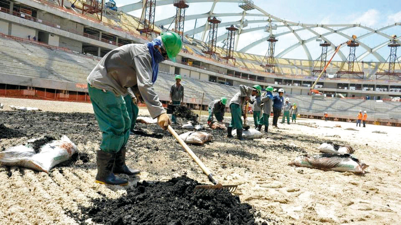 عمال يشاركون في تشييد مباني كأس العالم 2022 بقطر. أرشيفية