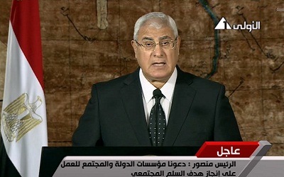 وقال منصور في كلمة وجهها للشعب عبر التلفزيون لمناسبة ذكرى حرب العاشر من رمضان (6 أكتوبر 1973)، "نمر بمرحلة حاسمة من تاريخ مصر"، التي يريد البعض دفعها "إلى الهاوية" و"سنخوض معركة الأمن والاستقرار حتى النهاية".