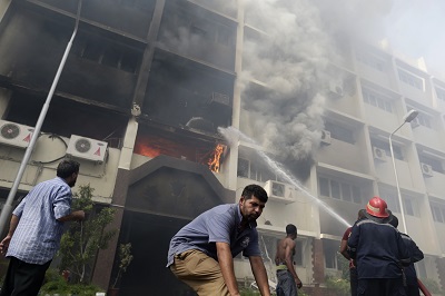 رجال إطفاء يحاولون إخماد نيران أشعلها أنصار الرئيس المعزول محمد مرسي في مبان حكومية بمنطقة الجيزة. أ ب