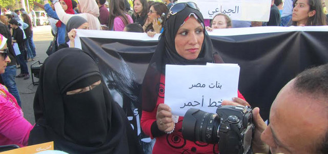 ممثلة تصبغ ذراعيها باللون الأحمر صبغت الممثلة «غيداء» ذراعيها باللون الأحمر احتجاجاً على تصاعد التحرش في مصر. وقالت «رسمت على ذراعي وساقي كفاً باللون الأحمر كالدماء لأن لدي أصدقاء كثيرين تعرضوا للتحرش في الميادين العامة وفى الشوارع، وعندما يتم الإبلاغ عن الواقعة في قسم البوليس يقوم بعض من أمناء الشرطة بالتحرش اللفظي لهم، مهللين ومباركين ما تم بهن من تحرش خارج أسوار القسم». وتابعت «المقصود من التحرشات الجماعية هو كسر المرأة لإجبارها على عدم نزولها، كما أرى أن هناك من يسعى لترسيخ نظرة دونية للمرأة، وأقترح بنزول شرطة نسائية لحماية المرأة في الشوارع، وإبداع أفكار جديدة لحماية المرأة عندما يتم التحرش بها». |