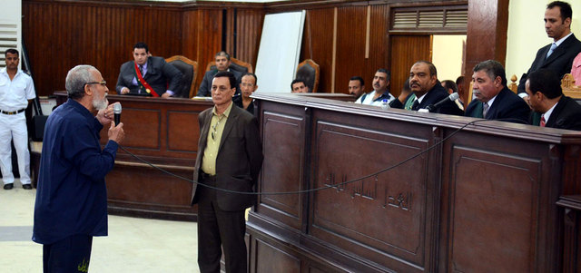 مرشد «الإخوان» محمد بديع يتحدث إلى القاضي خلال إحدى محاكماته. أرشيفيه أ.ب