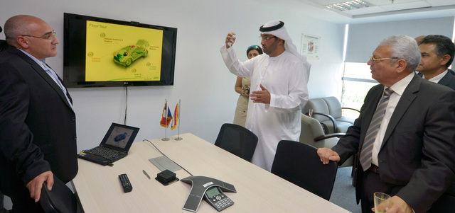 سلطان الجابر خلال جولته في القرية الذكية بالقاهرة برفقة وزير الاتصالات وتكنولوجيا المعلومات المصري أمس. وام