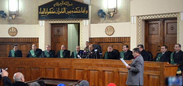قضاة محكمة النقض خلال جلسة محاكمة مبارك بتهمة الاختلاس أمس. إي.بي.إيه