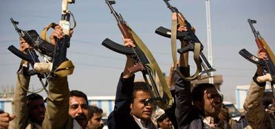 مسلحون حوثيون يرفعون أسلحتهم خلال اشتباكات أمس. أ.ب