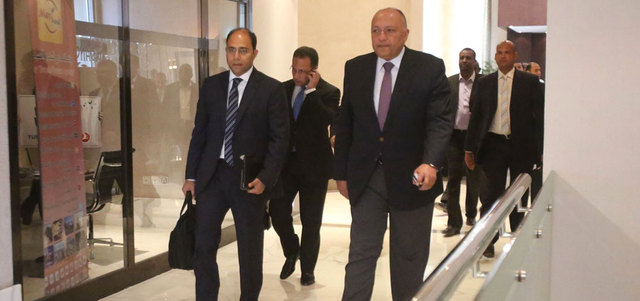 وزير الخارجية المصري سامح شكري (يمين) في طريقه إلى الاجتماع بالخرطوم. أ.ف.ب