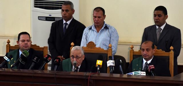 القاضي يقرأ الحكم على بديع وبقية المتهمين في الجماعة الإرهابية. أ.ف.ب