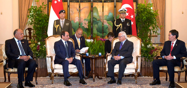 يأتي ذلك، في وقت بحث الرئيس المصري عبدالفتاح السيسي ونظيره السنغافوري توني تان، أمس، خلال جلسة ثنائية عقدت في قصر الرئاسة في سنغافورة، سبل تعزيز العلاقات الثنائية، إضافة إلى قضايا مكافحة الإرهاب والقضايا الإقليمية والدولية ذات الاهتمام المشترك.