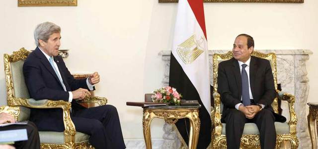 بحث الرئيس المصري، عبد الفتاح السيسي، أمس، مع وزير الخارجية الأميركي جون كيري، في القاهرة، الوضع في ليبيا، غداة إعلان السيسي استعداده للقيام بدور لإحياء عملية السلام بين الفلسطينيين وإسرائيل.