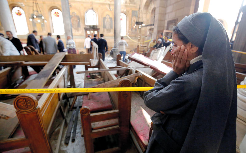 قُتل 25 شخصاً، وأصيب 49 آخرون، أمس، في تفجير إرهابي وقع داخل الكنيسة البطرسية الملحقة بكاتدرائية الأقباط الأرثوذكس بالعاصمة المصرية القاهرة، وفيما دان الرئيس المصري عبدالفتاح السيسي بشدة العملَ الإرهابي، متوعداً المتورطين ومعلناً الحداد الرسمي مدة ثلاثة أيام، شكلت وزارة الداخلية فريق بحث موسع لسرعة تحديد هوية الجناة وضبطهم.