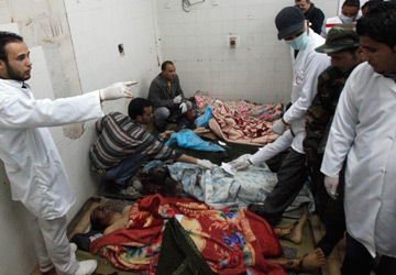 أعداد القتلى والجرحى بين صفوف المدنيين تتزايد مع تصاعد حدة الاشتباكات بين قوات القذافي والمعارضة. إي بي أيه