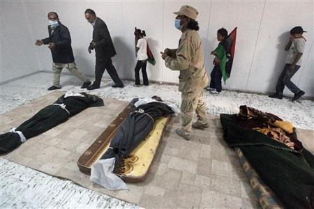 مواطنون ليبيون يلقون نظرة على جثامين معمر القذافي وابنه المعتصم بالله وقائد قواته ابو بكر يونس - رويترز