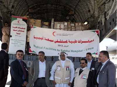 فقد وصلت إلى مطار العاصمة "طرابلس" طائرة إغاثة محملة بكميات كبيرة من الأدوية والمعدات الطبية وثلاث سيارات إسعاف تم تخصيصها لمستشفى مدينة سبها الذي يعاني شحا في هذا الجانب الحيوي وذلك في إطار حرص قيادة دولة الإمارات العربية المتحدة لدعم الأوضاع الصحية في الشقيقة ليبيا ومساندة الشعب الليبي الشقيق منذ تفاقم الأحداث التي شهدتها ليبيا في الفترة الأخيرة.