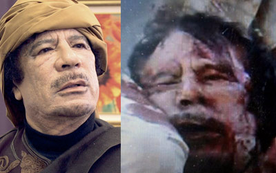 وقتل معمر القذافي وابنه المعتصم إثر اعتقالهما على يد ثوار سابقين في 20 اكتوبر 2011 في سرت وسط ليبيا. وعرضت جثتاهما أمام العموم في مصراتة الواقعة على بعد 214 كلم شرق طرابلس، قبل دفنهما في مكان بقي طي الكتمان.