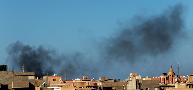 ارتفاع أعمدة الدخان خلال اشتباكات بين الجيش وميليشيات «فجر ليبيا» في بنغازي. رويترز
