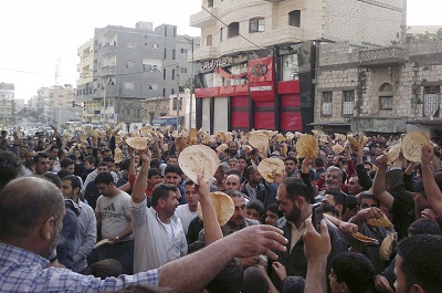 تظاهرة في بانياس حمل فيها المشاركون أرغفة الخبز احتجاجا على الأوضاع الاقتصادية في سورية. أ ب