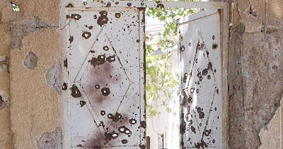 باب دار مدمرة نتيجة للاشتباكات. أ ف ب