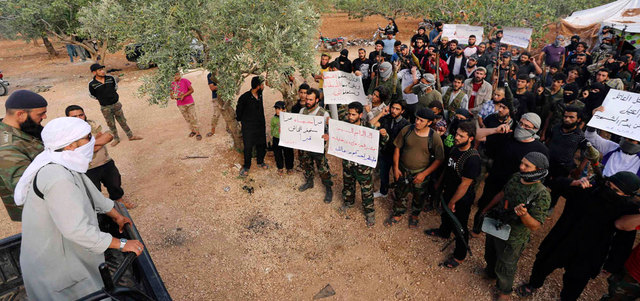 مقاتلون من الجيش الحر يرفعون لافتات خلال تجمع يدعو إلى بدء تحرير مدينة حماة من القوات النظامية. رويترز