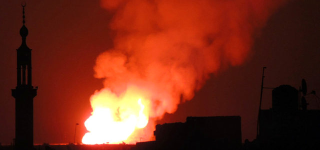 النار تشتعل في خطوط نقل الغاز بالقرب من مطار دمشق عقب استهدافها. رويترز ــ أرشيفية