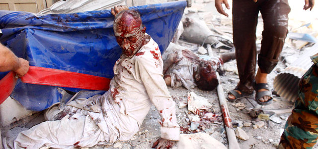 الدفاع المدني يساعد ضحايا سقطوا ببرميل متفجر ألقته القوات النظامية على حي قاضي عسكر بحلب. رويترز
