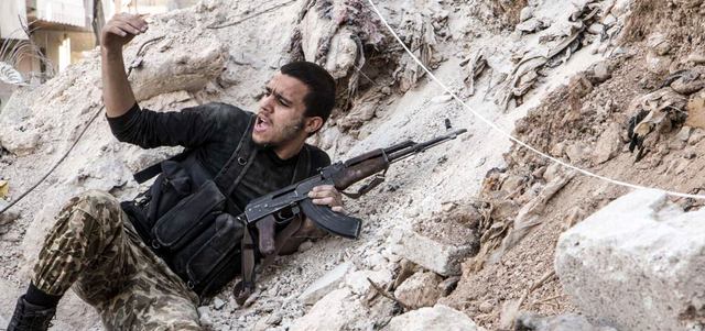 مقاتل من المعارضة ينادي رفاقه خلال اشتباكات مع قوات النظام في حلب. أ.ف.ب