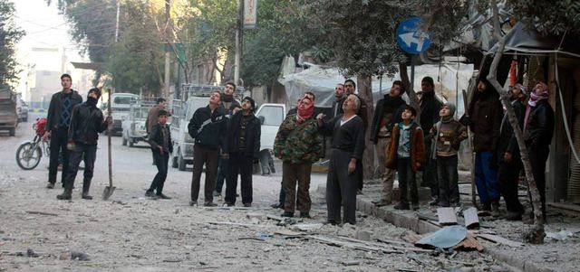 سكان في حي دوما في دمشق يشاهدون الحطام المتساقط من مبانٍ تضررت في غارة جوية للقوات السورية، أمس. رويترز