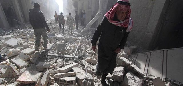 سوري يسير بين أنقاض ملطخة بالدماء عقب استهداف منطقة في حلب ببرميل متفجر. رويترز