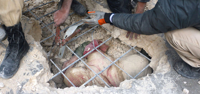 الدفاع المدني ينقذ ثمانينية من تحت أنقاض منزلها في حلب عقب غارة للنظام. أ.ف.ب