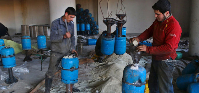 رجال يملأون أسطوانات الغاز بالمتفجرات لصناعة سلاح يسمى «بركان» داخل مصنع للسلاح في حلب. رويترز