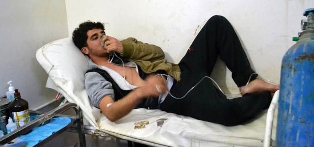 شاب يتنفس بواسطة قناع الأوكسجين في عيادة ببلدة سرمين جنوب شرق إدلب عقب هجوم بالغاز لقوات النظام على البلدة. أ.ف.ب