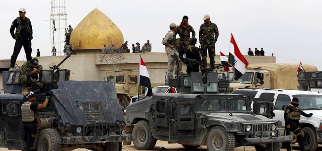 قوات الأمن العراقية قرب أحد مساجد تكريت استعداداً لاشتباكات مع «داعش». رويترز