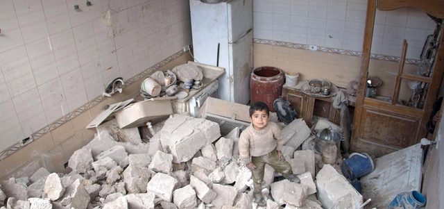طفل سوري يقف وسط أنقاض منزل أهله عقب استهدافه في غارة للنظام على حلب أمس. أ.ف.ب