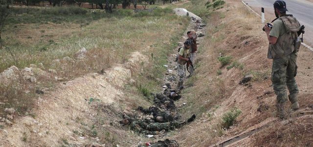 عناصر من «جبهة النصرة» يتفحصون جثثاً لأفراد من القوات النظامية قتلوا شمال غرب مدينة أريحا بريف إدلب. رويترز
