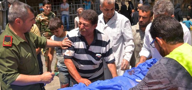 رجل يبكي قريبه الذي أصيب بسقوط قذيفة على حي الجميلية بحلب. إي.بي.إيه