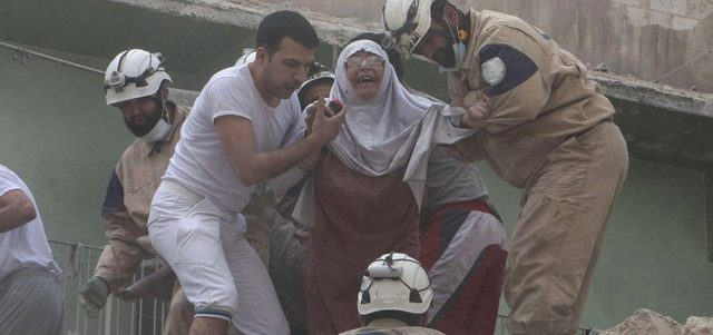 عمال إنقاذ ومدنيون يخلون عجوزاً من مبنى تهدم ببرميل متفجر ألقته قوات النظام على حي الفردوس بحلب. أ.ف.ب