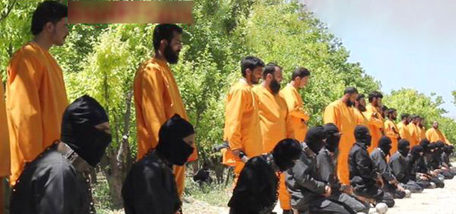 وتحت عنوان «قصاص المظلومين من الخوارج المارقين»، يقوم عناصر «جيش الإسلام» بإزالة الأقنعة عن وجوه الأسرى الـ18 الذين جثوا أرضاًً قبل ان يطلقوا النار على رؤوسهم من الخلف من بنادق حربية.
