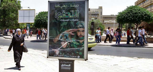 من ناحية أخرى، انتشرت في شوارع دمشق لوحات إعلانية تحث المواطنين على الالتحاق بالجيش، في وقت تفيد تقارير عن تخلف عدد كبير من الشبان عن الخدمة العسكرية الإلزامية، وعن خسائر بشرية كبيرة في صفوف الجيش الذي يقاتل على جبهات عدة. وحملت اللوحات التي علقت خلال الأسبوعين الماضيين عبارات «التحقوا بالقوات المسلحة» و«الجيش كلنا» و«بجيشنا نكسب بلدنا». ويبدو في إحدى اللوحات شاب يرتدي زياً عسكرياً ويحمل على كتفه بندقي، وإلى جانبه طفلة مبتسمة ترفع يدها اليسرى بإشارة النصر، كما ظهرت في الصورة امرأة من الخلف تضع حجاباً أبيض وترفع كذلك إشارة النصر. وتظهر في لوحة أخرى شابة بالزي العسكري وهي تسدد صوب هدف ببندقيتها، فيما يقف في خلفية الصورة جندي يؤدي التحية. وفي لوحة ثالثة تقف سيدة ترتدي وشاحاً أبيض كتفاً إلى كتف إلى جانب شاب بالزي العسكري ويحمل كل منهما بندقية على كتفه.