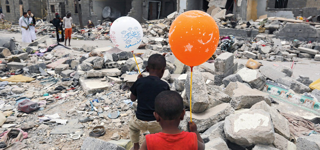 أطفال يحتفلون بالعيد وسط انتصارات المقاومة الشعبية على الحوثيين وقوات صالح التى دمرت البلاد. إي.بي.إيه
