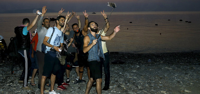 لاجئون سوريون يلتقطون «سيلفي» عقب نجاتهم ووصولهم إلى جزيرة كوس اليونانية قادمين من تركيا. رويترز