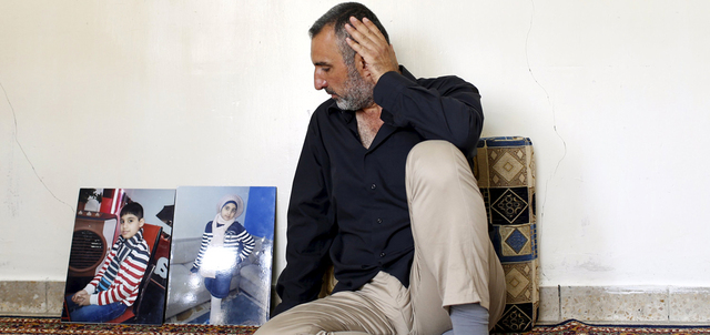 أحمد جواد بجوار صورتي ابنته وابنه اللذين فقدهما في القارب. رويترز