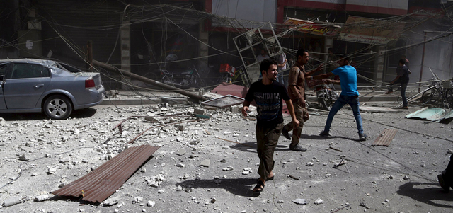 شبان يتفقدون الأضرار بعد غارة نفذتها القوات النظامية على مدينة دوما في الغوطة الشرقية. رويترز