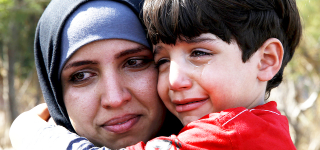 طفل سوري يبكي وهو يحتضن والدته بعد وصولهما إلى جزيرة ليسبوس اليونانية. رويترز