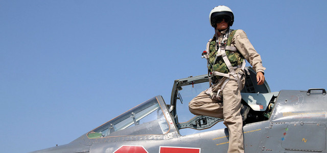 طيار روسي يعتلي قمرة قيادة الطائرة المقاتلة «سوخوي 25 إم» بقاعدة في اللاذقية. أ.ب