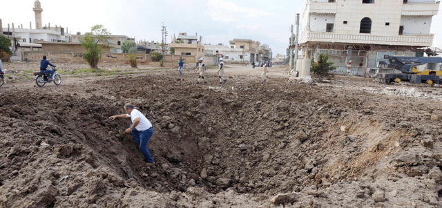 رجل يخرج من حفرة قال نشطاء إنها نتجت عن تفجير ببرميل متفجر ألقته قوات النظام على بلدة داعل شمال درعا. رويترز