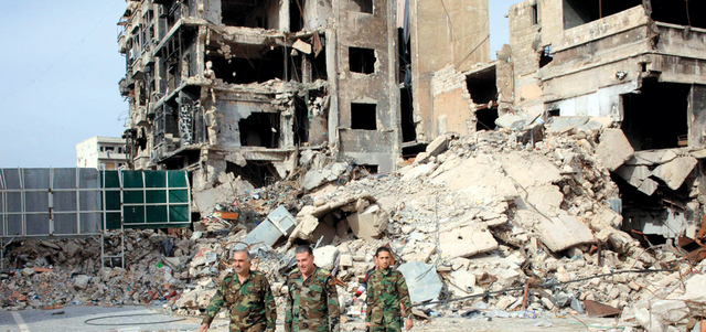 جنود من الجيش النظامي السوري يسيرون وسط الأحياء المدمرة في مدينة حلب، أمس. أ.ف.ب
