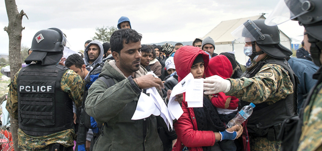 لاجئون يبرزون أوراق هويتهم للشرطة لعبور الحدود بين اليونان ومقدونيا. إي.بي.إيه