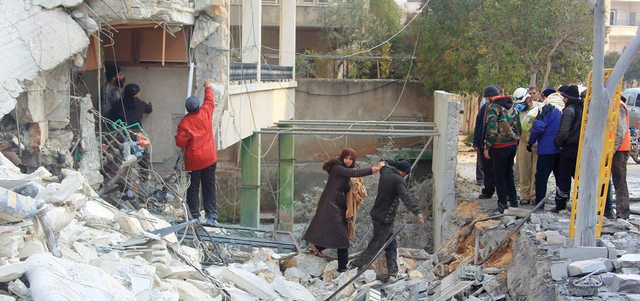 سوري يساعد سيدة تمر وسط الدمار في مدينة إدلب بعد الغارات الجوية. رويترز