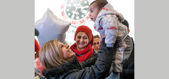 تيما الكردي تحمل الطفل شيروان ابن شقيقها محمد في مطار فانكوفر. أ.ب