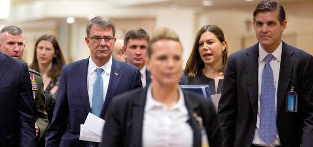 وزير الدفاع الأميركي «يسار» يصل إلى مقر «الناتو» في بروكسل لبحث الحرب ضد «داعش». أي.بي.أيه