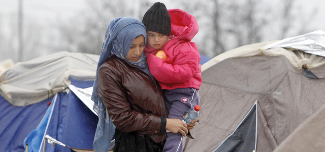 لاجئة سورية تحمل طفلاً وسط الأمطار على الحدود المقدونية. أ.ب