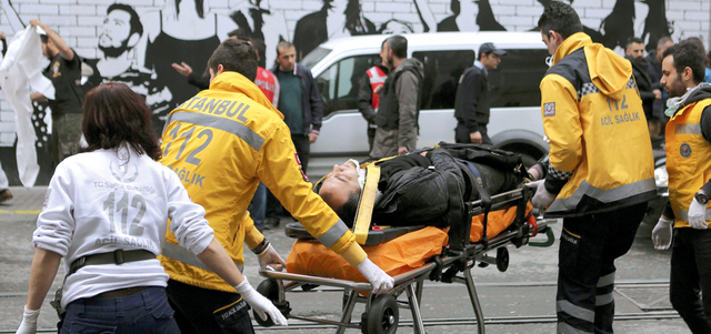 عناصر من خدمات الطوارئ يسعفون أحد المصابين في تفجير إسطنبول. رويترز